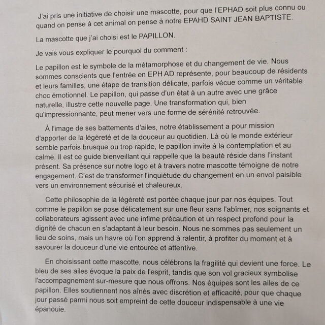 Le but, aujourd’hui, est de faire perdurer ce papillon afin qu’il devienne un symbole connu de tous : signe de l’âme de l’EHPAD Saint Jean-Baptiste et des belles personnes qui y travaillent avec cœur chaque jour.